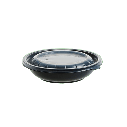 Caserolă salată rotundă neagră PP 1000 ml, cu capac transparent. Ideală pentru prezentare și livrare sigură. Perfectă pentru salate și poke bowls. Set 50 buc.
